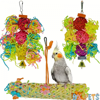 Wholesale Set de 3 Juguetes Coloridos para Jaulas de Aves - Bolas de Ratán y Papel Deshilachado para Loros, Periquitos